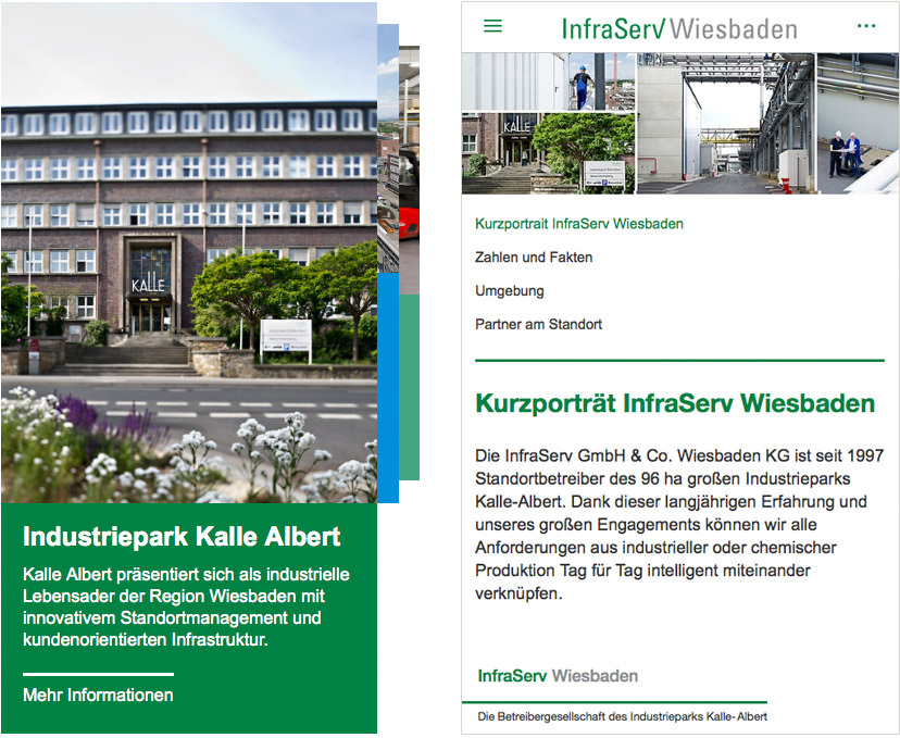 After a successful pitch, our task was to create the corporate website to address the various target groups of the Kalle-Albert Industrial Park. Core target group are potential prospective tenants for the respective open spaces of the industrial park as well as companies, which fall back on the manifold services of the InfraServ Wiesbaden subsidiary companies. The existing customers should also be offered the numerous services of the park operator. A digital “crisis and emergency management” in dealing with the neighborhood is also required.